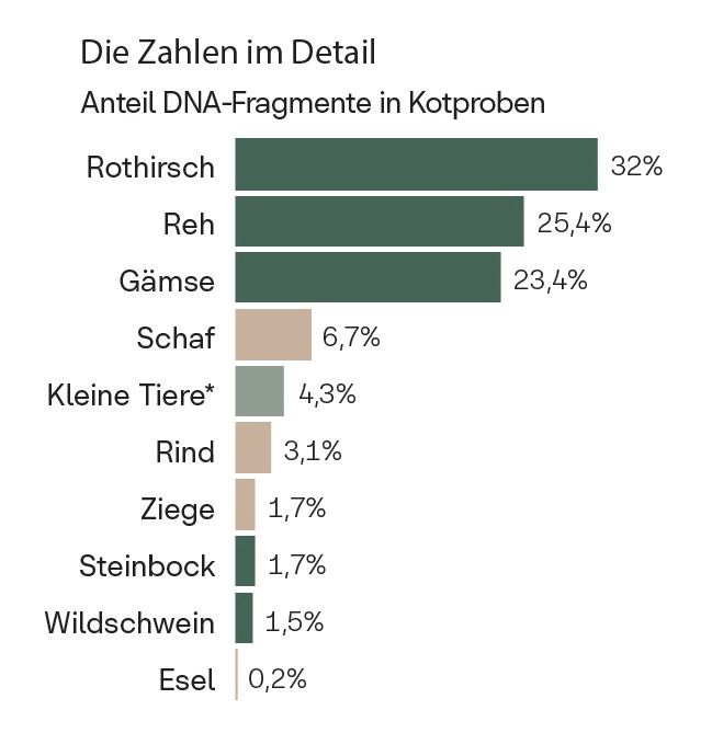 Diese Nahrungsanalyse wurde im Rahmen des KORA-Projekts «Integriertes Monitoring und Management» (IMM) durchgeführt. Sie ist Teil des PhD-Projekts von Florin Kunz, das in Zusammenarbeit mit dem Departement für Ökologie und Evolution der Universität Lausanne realisiert wird. Die Proben wurden vorwiegend von kantonalen Wildhüterinnen und Wildhütern gesammelt und eingesandt. Die genetischen Analysen erfolgten am LBC der Universität Lausanne mit finanzieller Unterstützung des BAFU und einer privaten gemeinnützigen Stiftung. Wir bedanken uns bei allen Beteiligten für die gute Zusammenarbeit.