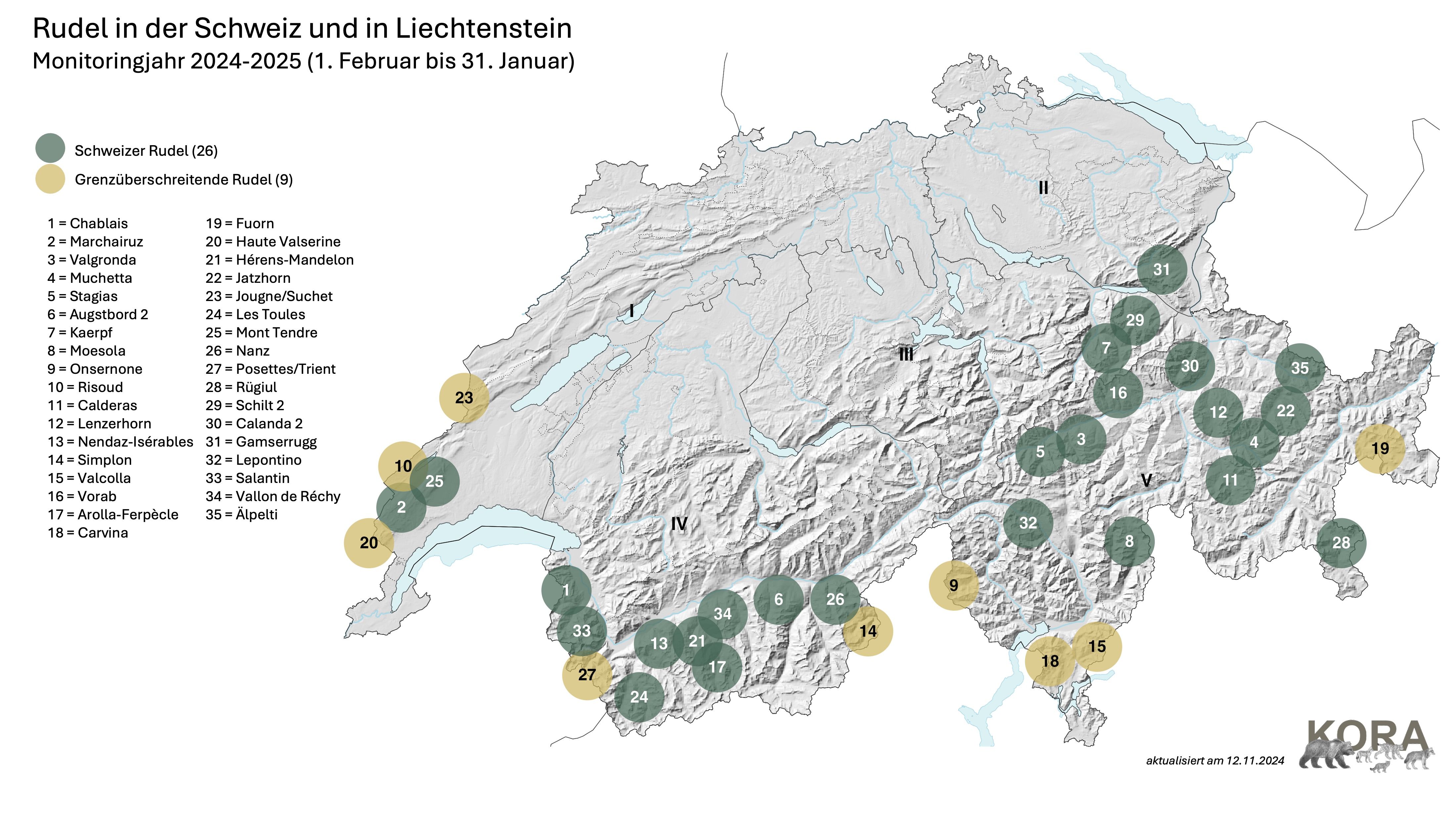 Wir bedanken uns bei den Schweizer Kantonen und dem Fürstentum Liechtenstein für die gute Zusammenarbeit. Eine nächste Aktualisierung der Rudelsituation folgt im März 2025.