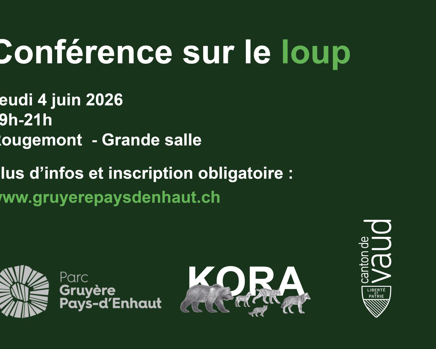 Der Kanton Waadt organisiert in Zusammenarbeit mit dem Regionalen Naturpark Gruyère Pays-d’Enhaut und der Stiftung KORA am Donnerstag, 4. Juni 2026, in Rougemont einen öffentlichen Anlass zum Thema Wolf. Diese kostenlose Veranstaltung soll die Bevölkerung über die aktuelle Situation der Art in den Waadtländer Voralpen, den Stand der wissenschaftlichen Erkenntnisse sowie die Instrumente zum Management dieses Grossraubtiers informieren.