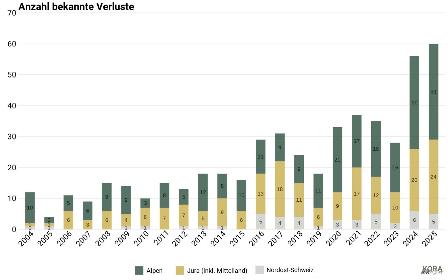 Die Verluste können auch im KORA Monitoring Center eingesehen werden. Weitere Angaben finden sie in den Jahresberichten des FIWI.