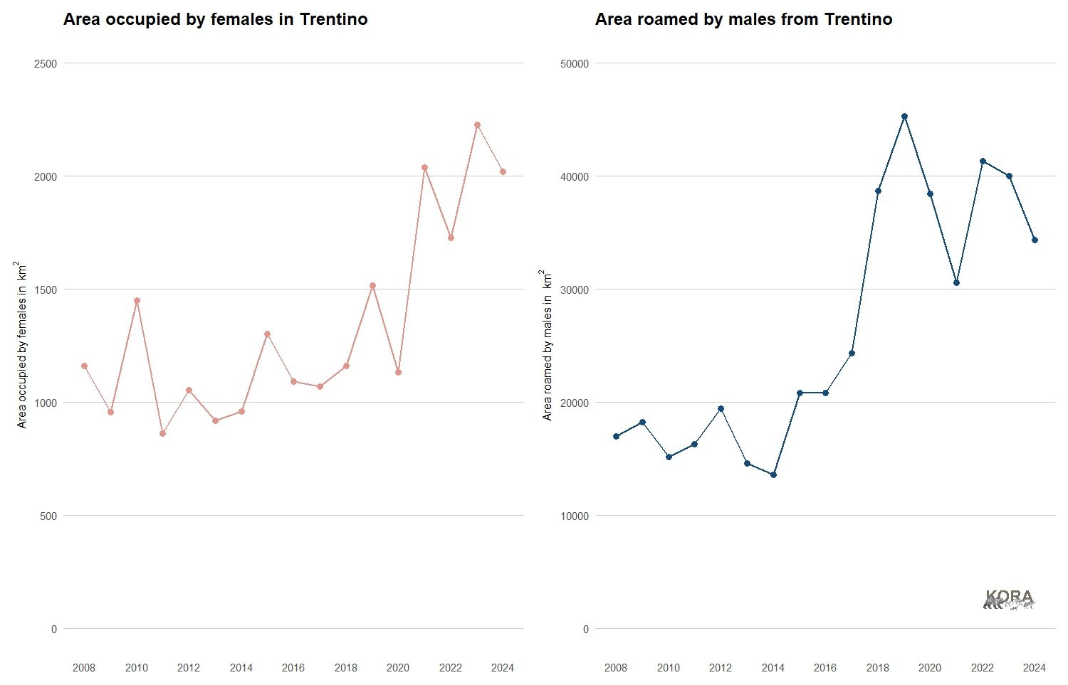Temporal development of the area occupied by females (left) and the area roamed by male bears from Trentino (right) from 2008 to 2024.