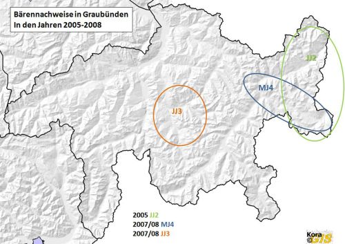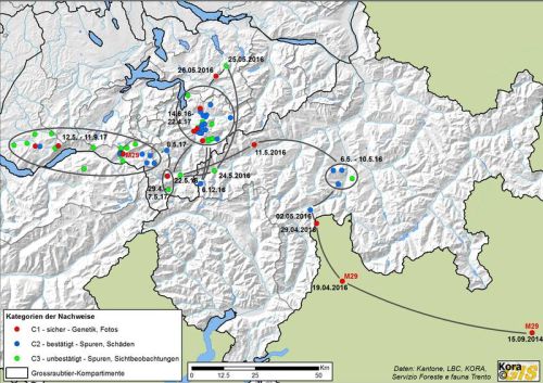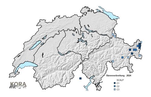 There is no resident population of brown bears in Switzerland. The map shows where immigrated individuals were staying in 2015.