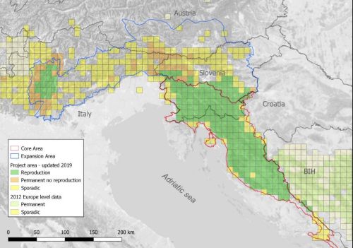 Bear distribution in the Alps and Dinaric mountains between 2012 and 2018 based on a 10×10 km grid. Green = permanent presence with reproduction (recorded within the last 3 years), orange = permanent presence (recorded in at least three years of the study period), yellow = sporadic presence (recorded in fewer than three years of the study period. The dark line indicates the core zone, the blue line the expansion zone, grey lines indicate country borders.