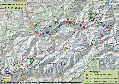 There is no resident population of brown bears in Switzerland. The map shows where immigrated individuals were staying in 2016.