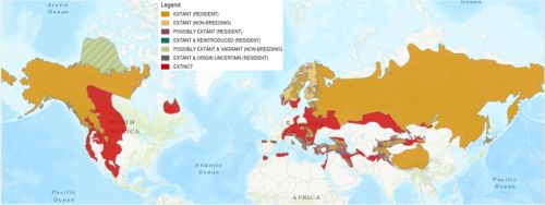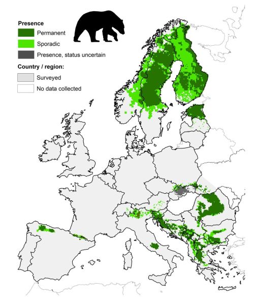 Distribution of the bear in Europe based on a 10×10 km grid and data from 2012–2016. Dark green = permanent presence (presence confirmed in at least 3 of the 5 years, or reproduction confirmed within the last 3 years), light green = sporadic presence (presence confirmed in less than 3 of the 5 years), grey = presence without detailed information. No data was available from country areas coloured white.