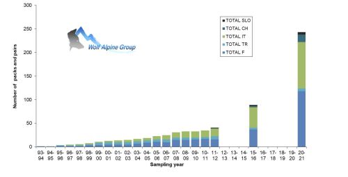 Development of wolf packs and pairs in the Alps