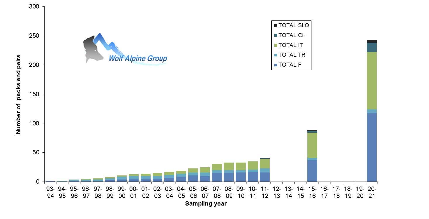 Evolution of the number of wolf packs and pairs in the Alps. F = France (blue), IT = Italy (green), CH = Switzerland (dark blue), SLO = Slovenia (black), TR = transboundary (light blue). The Wolf Alpine Group does not have the data from Italy for the years 2012-2015 and 2016-2019. Consequently, they were unable to present the complete data.