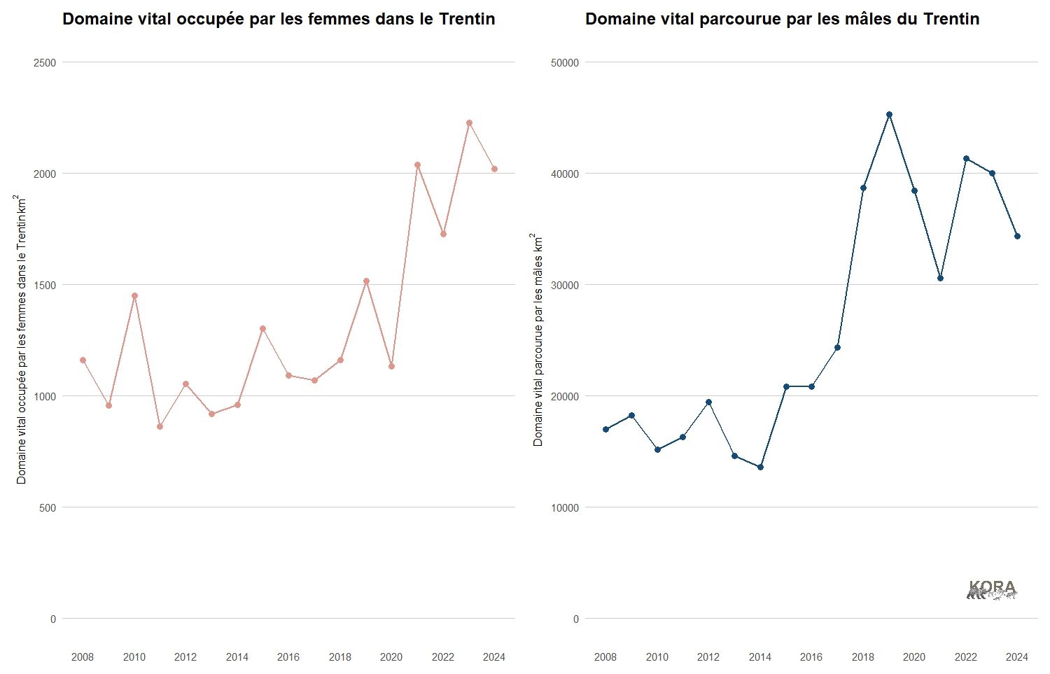 Notez les différentes échelles de l'axe vertical. Les mâles parcourent une zone beaucoup plus vaste que les femelles, qui n'ont jusqu'à présent été observées que dans le cœur de l'aire de répartition de la population. Données : rapports annuels du Trentin.