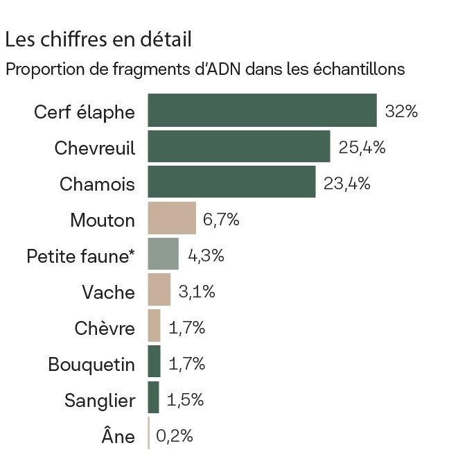 En juin 2024, nous avons publié les premiers résultats de l'étude « DNA Metabarcoding Reveals Wolf Dietary Patterns in the Northern Alps and Jura Mountain » sur notre site web. Depuis, nous avons poursuivi cette analyse : la période d’étude a été prolongée de deux ans, des échantillons de crottes supplémentaires ont été analysés et de nouveaux aspects ont été pris en compte. Nous pouvons ainsi mettre en évidence les différences dans le régime alimentaire selon la région et le statut social des animaux. Cependant, la conclusion principale reste inchangée : en Suisse, le loup se nourrit principalement d'animaux sauvages. Les animaux de rente tels que les moutons, les chèvres ou les bovins jouent un rôle secondaire selon la région.