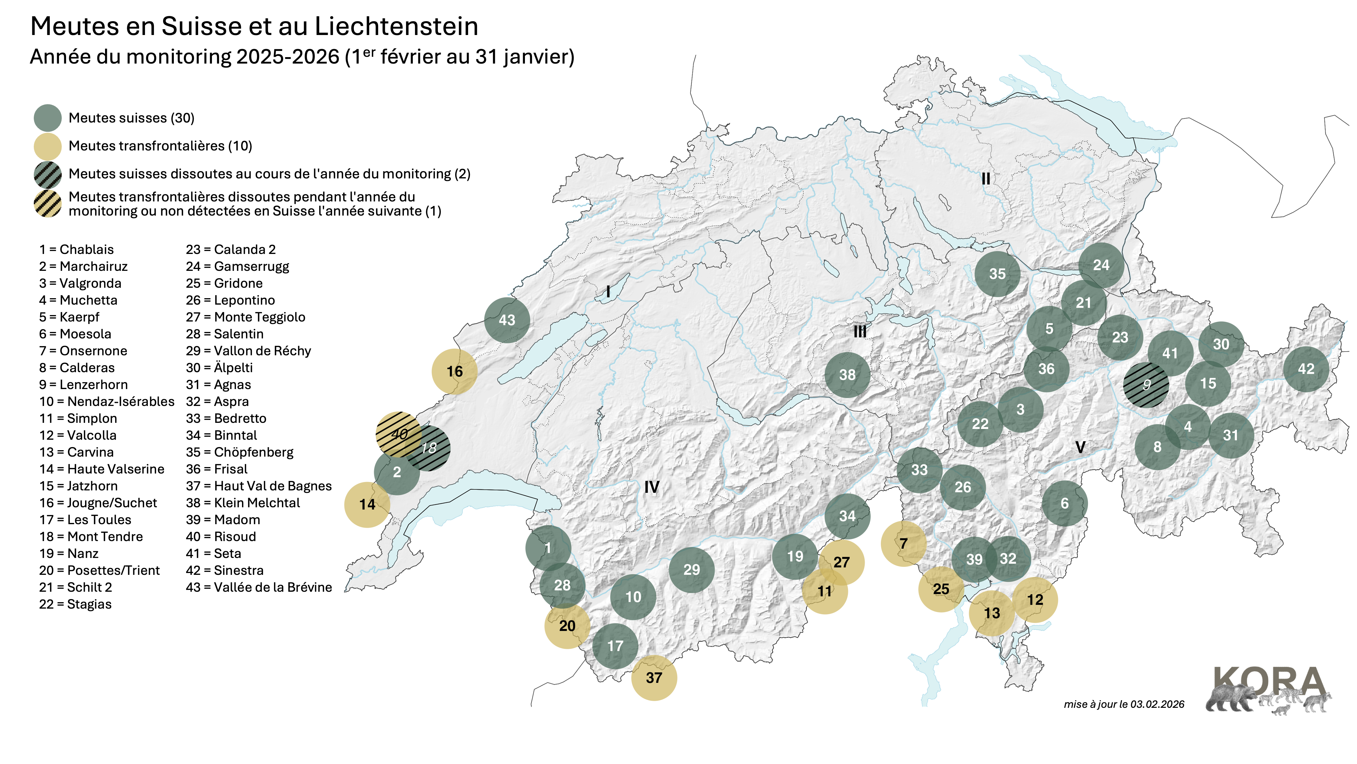 Nous remercions les cantons suisses, la Principauté du Liechtenstein et l'Office fédéral de l'environnement (OFEV) pour leur bonne collaboration. La prochaine mise à jour sur la situation des meutes et l'évolution des effectifs aura lieu en fin de mars 2026.