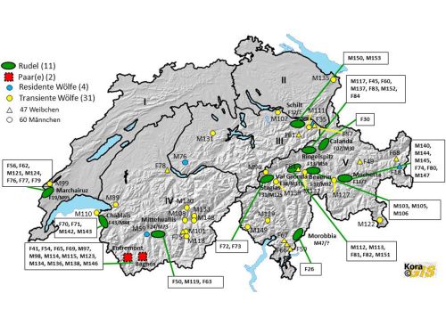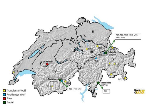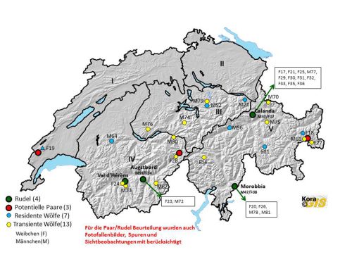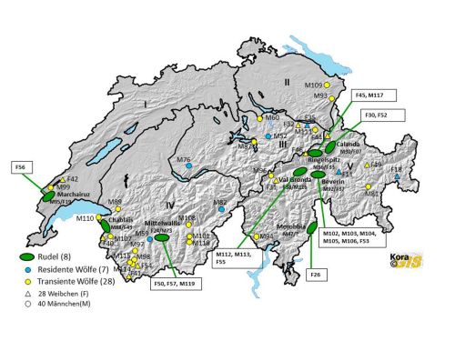 Observations de loups en Suisse durant les 24 derniers mois (situation au 19.12.2018). Les différents loups identifiés génétiquement sont marqués par un symbole combiné à un numéro (M = mâles, F = femelles). Symbole jaune = animaux transitoires, bleu = animaux résidents, vert = meute. Les individus dans les boîtes sont les descendants des membres de la meute. Les individus morts et ceux qui ont quitté la Suisse ne sont pas représentés. Les analyses génétiques sont menées par le Laboratoire de Biologie de la Conservation (LBC) de l’Université de Lausanne. Le statut correspond aux définitions énoncées à l’annexe 4 du Plan Loup. Données