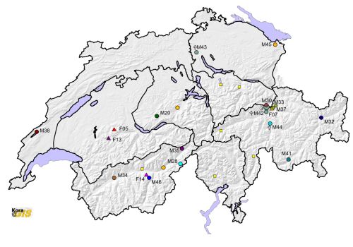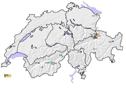 Source des données : LBC, cantons, particuliers, OFEV; Carte : © KORA/Swisstopo