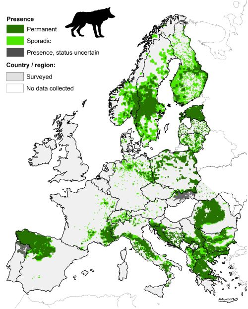 Distribution du loup en Europe sur la base d’un quadrillage de 10×10 km, données de 2012 à 2016. Vert foncé = présence permanente (détectée pendant 3 années sur 5 au moins ou reproduction attestée pendant les 3 dernières années), vert clair = présence sporadique/fluctuante (détectée pendant moins de 3 années sur 5), gris = présence sans information précise. Aucune donnée n’était disponible pour les pays et régions sur fond blanc.