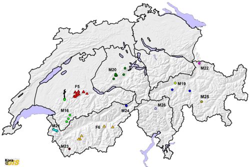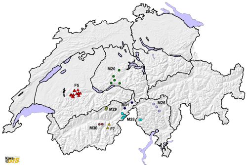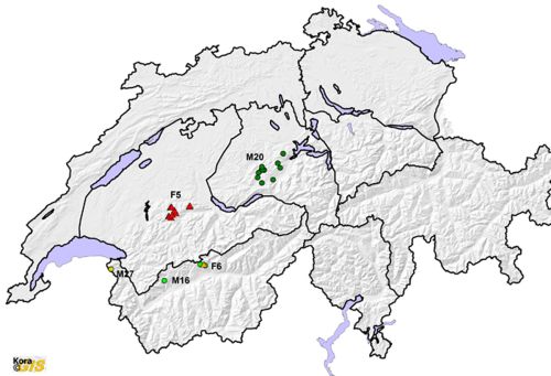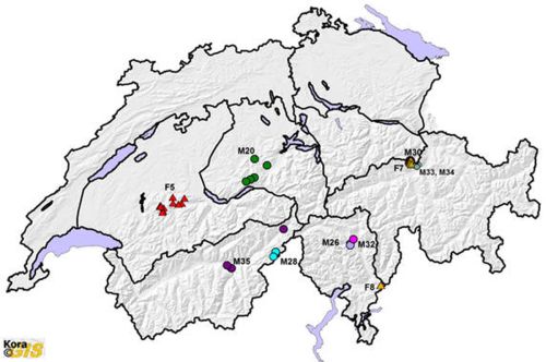 Observations de loup en Suisse dans les derniers 24 mois (Statut 31. Décembre 2011). Les différents loups identifiés génétiquement sont marqués avec un symbole et un numéro de séquence (M = mâles, F= femelles). Les analyses génétiques sont menées par le Laboratoire de Biologie de la Conservation (LBC) de l’Université de Lausanne. Données