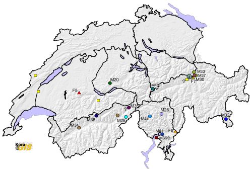 Observations de loup en Suisse dans les derniers 24 mois (Statut 31. Décembre 2014). Les différents loups identifiés génétiquement sont marqués avec un symbole et un numéro de séquence (M = mâles, F= femelles, carrés jaunes= des individus inconnus). Les individus morts et ceux qui ont quitté la Suisse ne sont pas représentés. Les trois petits restant en région du Calanda de 2013, sont illustrés par un cercle plus grand. Les analyses génétiques sont menées par le Laboratoire de Biologie de la Conservation (LBC) de l’Université de Lausanne. Donées
