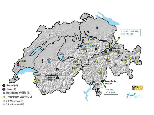 Observations de loups en Suisse durant les 24 derniers mois (situation au 15.01.2021). Les différents loups identifiés génétiquement sont marqués par un symbole combiné à un numéro (M = mâles, F = femelles). Symbole jaune = animaux transitoires, bleu = animaux résidents, vert = meute. Les individus dans les boîtes sont les descendants des membres de la meute. Les individus morts et ceux qui ont quitté la Suisse ne sont pas représentés. Les analyses génétiques sont menées par le Laboratoire de Biologie de la Conservation (LBC) de l’Université de Lausanne. Le statut correspond aux définitions énoncées à l’annexe 4 du Plan Loup. Données