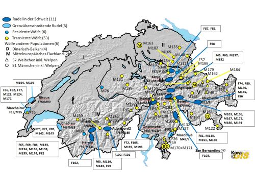 Observations de loups en Suisse durant les 24 derniers mois (situation au 04.01.2022). Les différents loups identifiés génétiquement sont marqués avec un symbole combiné avec un numéro (M = mâles, F= femelles). Symbole jaune = animaux tansitoires, bleu = animaux résidents, ellipse bleu foncé = meute, ellipse bleu clair = meute transfrontalière. Les individus dans les boîtes sont les descendants des différents millésimes des meutes. Les individus morts et ceux qui ont quitté la Suisse ne sont pas illustrés. Les analyses génétiques sont menées par le Laboratoire de Biologie de la Conservation (LBC) de l’Université de Lausanne. Le statut correspond aux définitions du concept de loup, annexe 4.