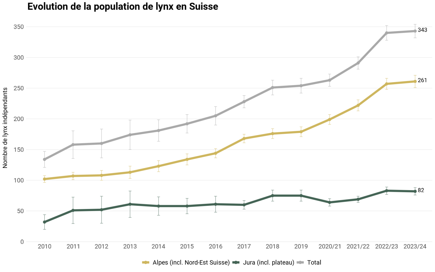 Evolution du nombre de lynx en Suisse (2010-2023/24) : A partir de l'année 2020/21, la représentation se base sur l'année biologique. Les périodes de recensement s'étendront alors du 1er mai de l'année précédente au 30 avril de l'année suivante. © KORA