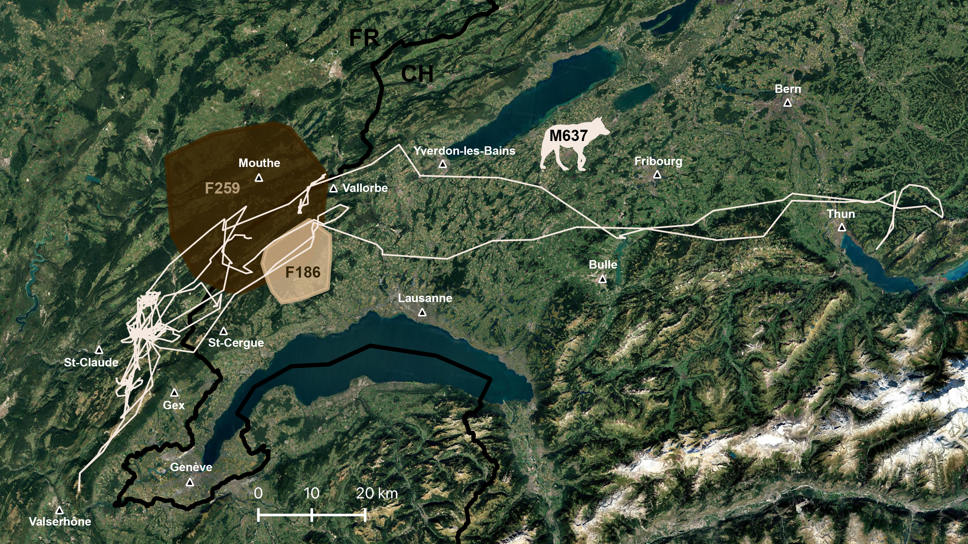 Déplacements de M637 et territoires des deux louves, qui avaient été dotées d’un collier GPS (F259 et F186).© KORA