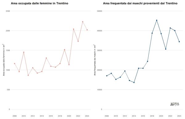 Nota bene: Osservate le diverse scale dell'asse verticale. I maschi percorrono un'area molto più vasta delle femmine, che finora sono state osservate solo nel loro area principale. Dati: rapporti annuali del Trentino.