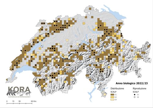 La Svizzera è stata suddivisa in parti più piccole utilizzando una griglia di 5x5 km. Se è stato effettuato un rilevamento all'interno di una cella della griglia durante l'anno biologico (01.05.-30.04.), questa è colorata nella categoria SCALP più alta. Tuttavia, la mappa non fornisce indicazioni sul numero di rilevamenti effettuati all'interno di una cella della griglia. Ce n'era almeno uno in ogni caso.