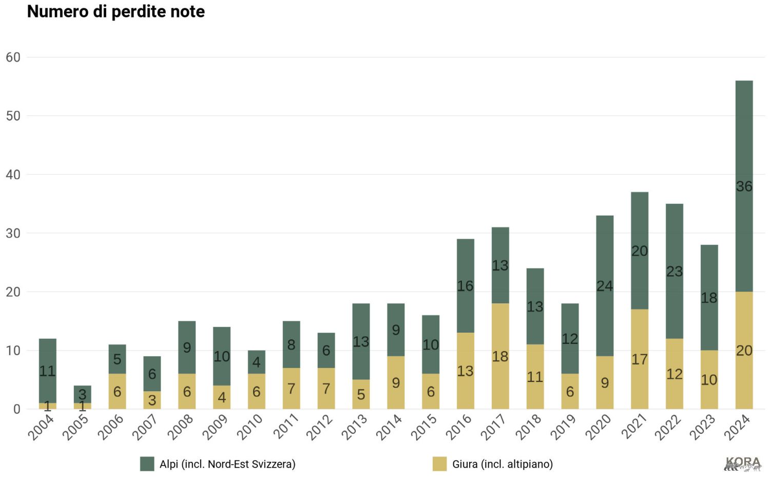 Il numero di perdite note in Svizzera, pari a 58 linci nel 2024, è doppio rispetto all'anno precedente e rappresenta un record dall'introduzione della specie in Svizzera. La maggior parte degli animali trovati erano cuccioli nel primo anno di vita, seguiti da linci adulte e subadulte alla ricerca di un territorio.