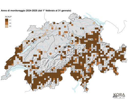 Spiegazioni aggiuntive: Le categorie SCALP (rosso = categoria SCALP C1, “fatti concreti”, blu = categoria SCALP C2, segnalazioni confermate, verde = categoria SCALP C3, informazioni non verificabili) inclusi i campioni genetici positivi. La data di raccolta è decisiva per i campioni genetici. I dati del Cantone dei Grigioni sono incompleti.