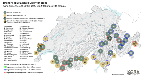 Durante l'anno di monitoraggio 2024/25 (dal 1° febbraio 2024 al 31 gennaio 2025), è stata confermata la presenza di 39 branchi in Svizzera, due in più rispetto all'anno di monitoraggio precedente. Di questi, 26 si trovano interamente in Svizzera, mentre 13 occupano territori anche nei Paesi limitrofi. Tre branchi si sono sciolti nel corso dell'anno, in seguito all'eliminazione della coppia riproduttiva.