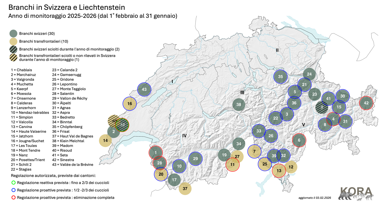 Durante l'anno di monitoraggio 2025/26 (dal 1° febbraio 2025 al 31 gennaio 2026), è stata confermata la presenza di 43 branchi in Svizzera, due in più rispetto all'anno di monitoraggio precedente. Di questi, 32 si trovano interamente in Svizzera, mentre 11 occupano territori anche nei paesi limitrofi. Due branchi sono stati considerati sciolti nel corso dell'anno. Finora sono stati osservati 148 cuccioli.