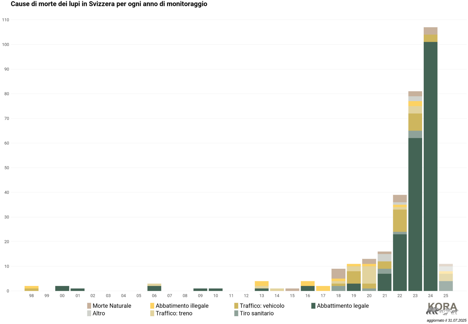 In Svizzera, la causa più comune di decesso per i lupi è l’abbattimento con arma da fuoco. Ulteriori cause importanti di morte per i lupi in Svizzera sono gli incidenti stradali e gli abbattimenti illegali.